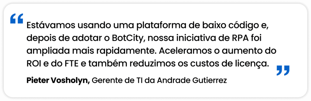 A Andrade Gutierrez acelerou sua iniciativa de hiperautomação ao adotar o BotCity, abandonando uma plataforma de baixo código para obter resultados mais rápidos e eficientes com automação em Python.